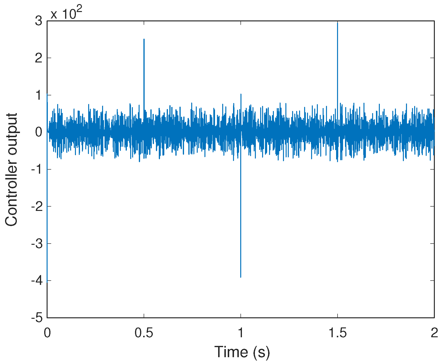 To provide a comprehensive evaluation of the derivative action behavior, the controller output of the FGO-tuned softsign-FOPID structure has been visualized under noisy measurement conditions and disturbance events. The resulting transient output signal is depicted in