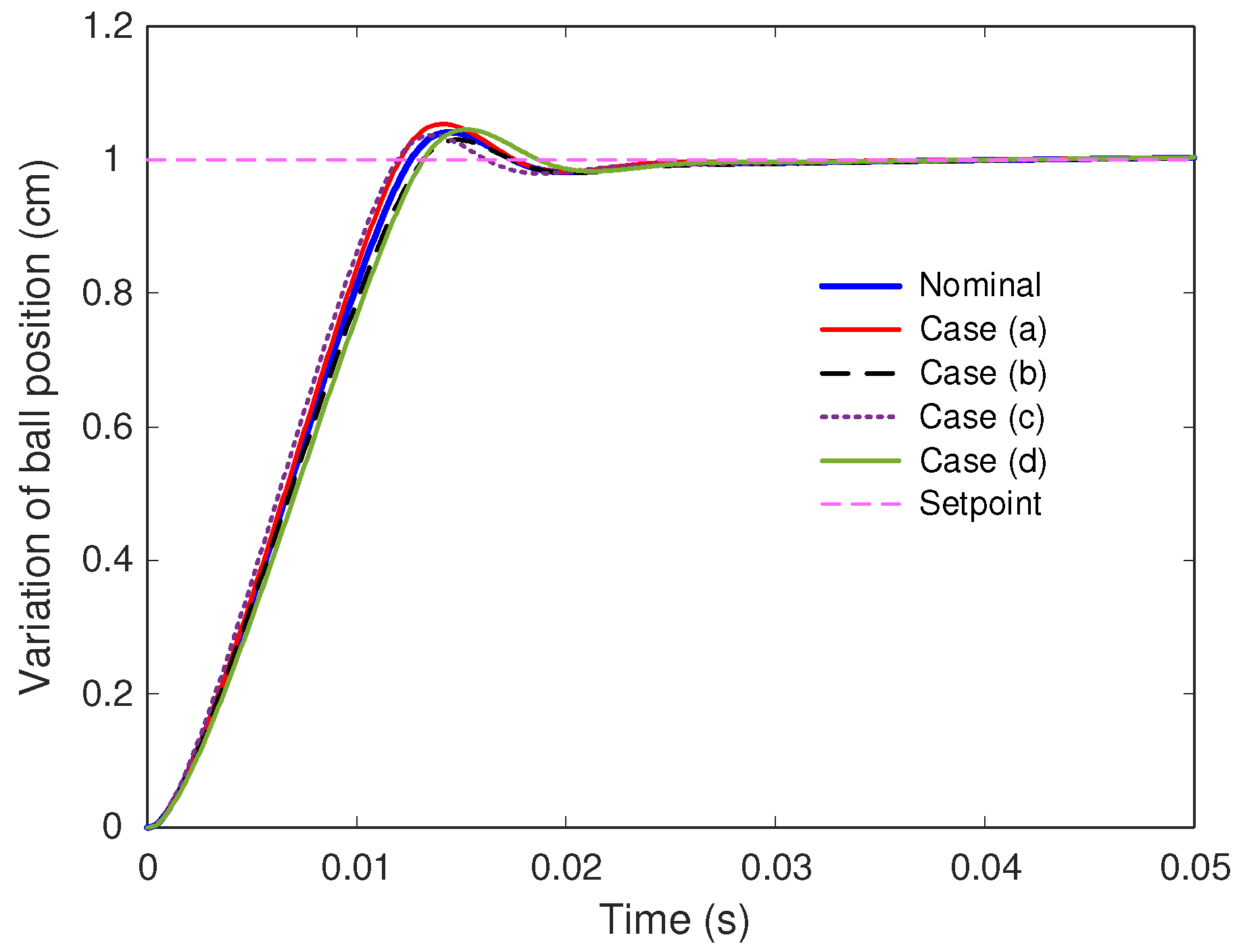 Figure 14. In this study, the coil resistance (R) and inductance (L) were selected as the uncertain parameters, as they directly influence the electromagnetic force generation and dynamic response of the levitation system. Four perturbed scenarios were defined around the nominal configuration as shown in
