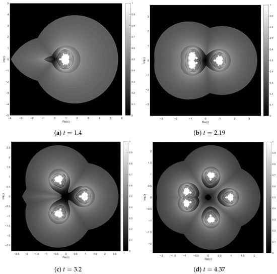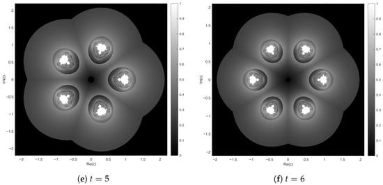 Remark 1. The values in Table 3 for such that are the counterexamples which prove that the preservation of symmetry properties is lost for the odd parameters, thus contradicting the symmetries satisfied for the even parameters in Theorem 2 and Corollary 1. Theorem 3. A fuzzy Mandelblog set of parameter t has t-fold rotational symmetries where .