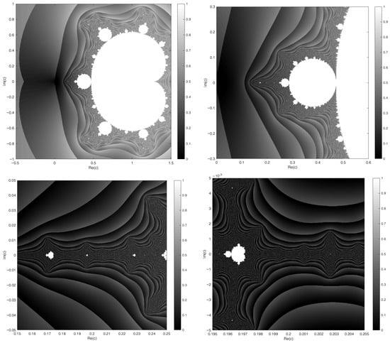 Figure 4 to illustrate the approximate self-similarity and scaling behavior inherent to the fuzzy extension of the Mandelblog sets. This zooming behavior mirrors the fuzzy Mandelblog set’s quasi-self-similarity property: similar geometric patterns repeat at different sizes with consecutive magnifications, however, not in exactly the same form.