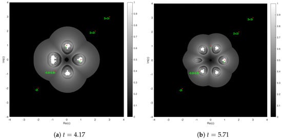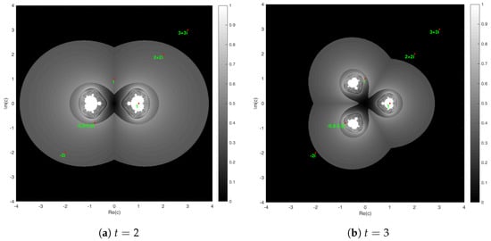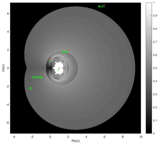 Secondly, it is found that the escape criteria is equal for and because of in the second iteration step where . Consequently, . This means that the membership degree of and is identical and approximately . These points on the fuzzy Mandelblog set of are the pixels with the same color.