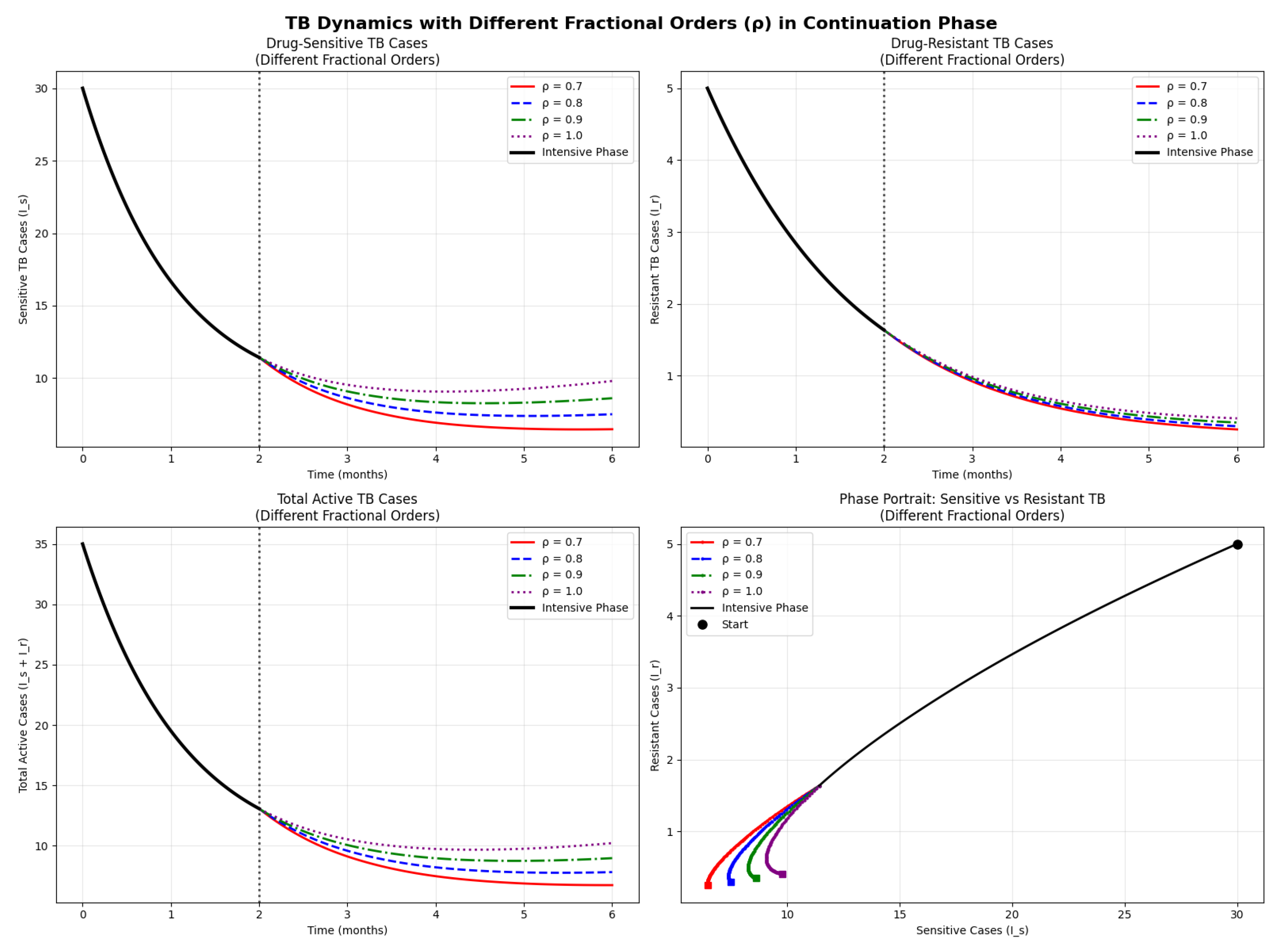 - Phase 2 (): To capture the long-term immunological memory effects, such as T-cell memory development, long-lasting medication effects, and the cumulative history of immune responses, the continuation phase uses the ABC fractional derivative. The memory of latent infection dynamics and resistance development routes are denoted by the words ML(L,t) and MR(Ir,t), respectively.