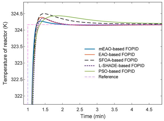 Recently, fractional-order PID (FOPID) controllers have emerged as promising alternatives to the classical control method in the industry [32]. Compared to the conventional integer-order (IO) PID controllers, the FOPID controller possesses more tuning freedom and wider range of parameters for stable control, leading to the improvement in control robustness [22,33]. In this context, the FOPID has been adopted for stabilizing the temperature of the CSTR and to maintain optimal reaction processes. Ref. [34] developed an efficient FOPID controller tuned by a Modified Grey Wolf Optimizer (MGWO) to regulate the temperature of a CSTR. Comparative results showed that the proposed MGWO-FOPID achieved a significantly lower fitness value compared with the conventional GWO-PID controller. In [35], four different structures of FOPID were proposed by combining NN and Ant Colony Optimization (ACO), and the robustness of these controllers was investigated. The findings demonstrated that the FOPIDNN controller with a three-layer structure had a decent ability to rapidly minimize the variance between real and desired routes. Ref. [36] investigated the hybridization of the State of Matter Search (SMS) algorithm with chaotic maps and elite oppositional-based learning. This hybrid algorithm was used to find optimal parameters of the FOPID controller for the temperature control of a CSTR and presented superior and optimum performance compared with FOPID controllers based on SMS-FOPID, PSO-FOPID, and Cuckoo Search (CS). Although these approaches improve transient performance, most existing optimizers either converge prematurely or exhibit limited precision near the optimal region when applied to strongly nonlinear thermal systems.