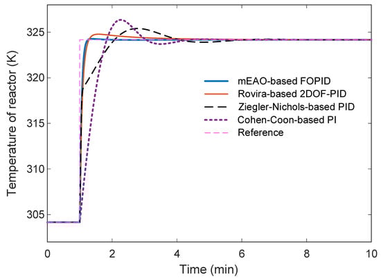 PID controllers are widely used across numerous industrial domains due to their simplicity, reliability, and ease of implementation [22,23]. Beyond chemical reactors, PID-based schemes play a central role in motor-speed regulation, electrical-machine drives, power-system excitation control, HVAC temperature management, fluid-flow regulation in pipelines, and liquid-level stabilization in storage tanks. Recent studies demonstrate the broad utility of PID and fractional-order PID variants in applications ranging from PMSM speed servo drives [24] to generator excitation control [25] and advanced HVAC temperature regulation in industrial environments [26]. However, efficient performance of the PID heavily depends on appropriate parameter tuning. To enhance control accuracy, numerous studies have explored powerful tuning techniques for PID controllers. Ref. [27] applied fuzzy logic theory to determine PID gain values and demonstrated that the fuzzy-based PID controller achieved superior setpoint tracking compared with the conventional PID and Ziegler–Nichols (ZN) methods. To further improve parameter identification and control precision, intelligent optimization algorithms have also been used. Ref. [28] integrated an improved Firefly Algorithm and an enhanced Sparrow Search Algorithm into the PID framework for the accurate control of CSTR temperature. A hybrid tuning method combining ZN based initialization with intelligent optimization algorithms was reported in [29]. The results showed that the controller parameters were best optimized by Particle Swarm Optimization (PSO) irrespective of the disturbances compared with the Genetic Algorithm. The integration of Neural Network (NN) and PSO into the tuning of a PID controller was further investigated in [30]. The proposed PSO-tuned NN-PID controller achieved faster rise time, reduced overshoot, and shorter settling time than both NN-PID controller and conventional ZN-tuned PID controller. In [31], a nonlinear PID controller combined with a Radial Basis Function Neural Network (RBFNN) was proposed for CSTR temperature control. Simulation studies demonstrated notable improvements in setpoint tracking, disturbance rejection, and parameter variation compared with the adaptive RBFNN-based PID controller.