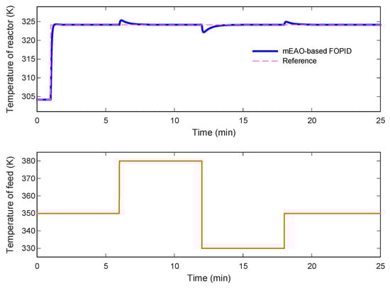 profile. Despite abrupt ∓25 K feed-temperature shifts, the controller suppresses deviations within a few seconds, preventing any sustained offset. This confirms the proposed mEAO-based FOPID controller’s superior rejection capability against external heat-input perturbations.
