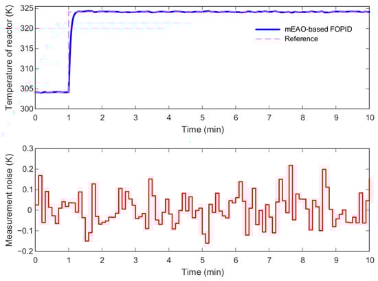As depicted in Figure 16, the upper subplot illustrates that the reactor-temperature output remains almost unaffected, with the control signal maintaining smoothness and minimal oscillation, while the lower subplot shows the injected noise pattern. The negligible propagation of measurement noise to the control output confirms that the derivative-filter term