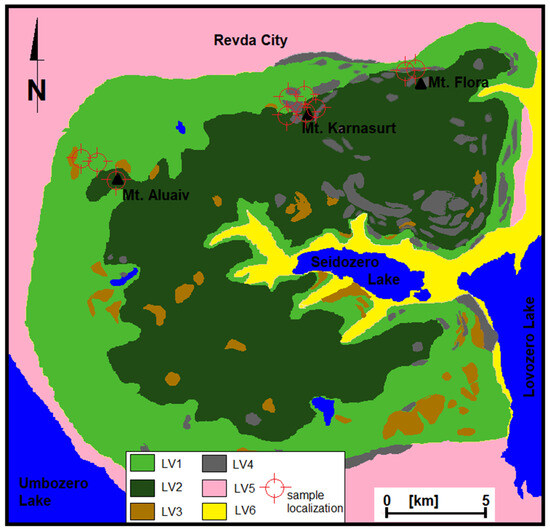 Generalized geological sketch of the Lovozero (after Mikhailova et al. [90] changed by author). Rocks abbreviations: LV1—syenite-layered complex; LV2—eudialyte complex with lujavrites and jovites; LV3—ijolites; LV4—porphyrites; LV5—surrounded cratonic rocks; LV6—quaternary sediments.