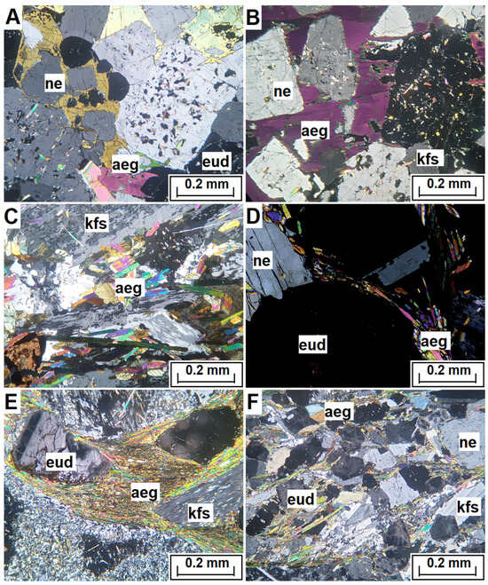 Microphotographs of typical rocks of the Lovozero Massif: massive syenite (A), nepheline-aegirine foyaite (B), aegirine-nepheline lujavrite (C), aegirine-eudialyte lujavrite (D), aegirine-eudialyte foyaite (E), and jovite (F). Small crystals of loparite can also be seen in the rock. These accessory crystals tend to be euhedral in shape and show twinning. Used abbreviations: aeg—aegirine, eud—eudialyte, ne—nepheline, kfs—alkaline feldspar.
