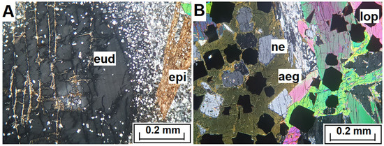 Examples of augite porphyrites (A) and vein rocks—loparitite (B). Used abbreviations: aeg—aegirine, eud—eudialyte, ne—nepheline, lop—loparite, epi—epistolite.