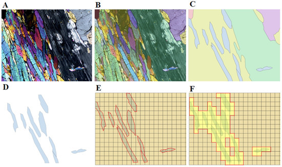 Example of counting crystal boundary contour: original microphotograph (A), contrast changes (B), marking the boundaries of counted minerals (C), removing the cones of minerals not included in the calculations (D), grid overlay (E), calculating boxes (F).