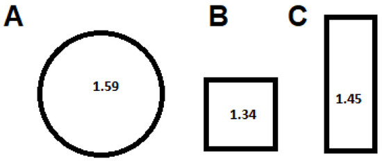 where x1 and x2 correspond to the number of passes of the individual squares x1 and x2 of the contour of the shape, with d1 and d2 of their respective side lengths. During the fractal analyses, a grid with meshes of 100, 50, 25, and 12 pixels was selected, respectively. In order to illustrate the operation of Formula (1), the authors subjected a circle, square, and rectangle to fractal studies (see Figure 6). The calculation results are presented in this figure. During the analysis of the fractal coefficient, the initial size of the analyzed mineral in relation to the size of the sides is important. The authors tried to select micrographs of the analyzed minerals so that their size exceeded the size of the analyzed boxes and allowed for a precise fractal analysis.