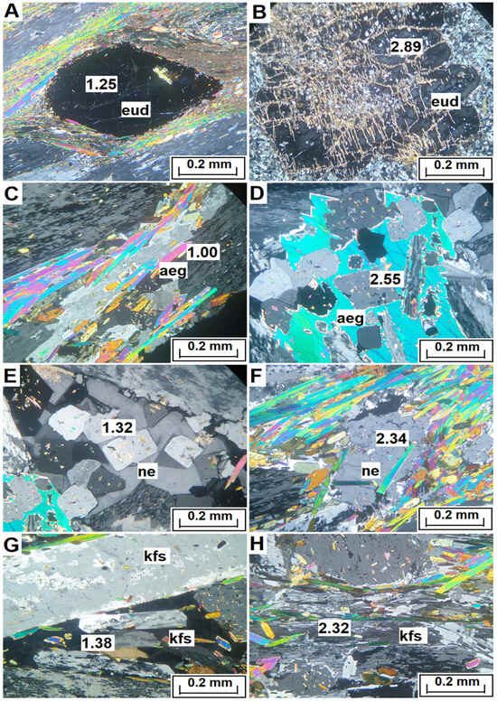 These rocks are green in color with red dots with a medium-crystalline, linear texture (Figure 3D). In these rocks, aegirine crystals form numerous needle-like columns of polycrystalline filling the spaces between other minerals occurring in the discussed rocks. Similarly to the above-mentioned lujavrites, they also have numerous inclusions in other minerals. They co-occur with eudialyte, which in these rocks has a distinctly anhedral shape, sometimes forming rounded crystals. Eudialyte appears in the form of small crystals, which sometimes shows zonality. Nepheline and apatite occurring in them also have an anhedral shape similar to polygons, sometimes with an uneven line of the crystal boundary. Nepheline has shown numerous indentations that may resemble the corrosion of this mineral. In the rocks discussed, potassium feldspars occur mainly in the form of small, irregularly shaped crystals, interspersed with numerous inclusions.