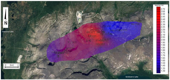 The distribution of the fractal dimension factor of the analyzed minerals was obtained by applying data on the geographical location of the sampling points on the map, and showing the average fractal dimension factor, examined for several minerals of a given rock. In this way, a map was created connecting the data obtained from the measurement of points with isolines. Below, the distribution of the fractal coefficient measured for the four minerals discussed above is given. In the case of aegirine (Figure 8), the highest fractal dimension coefficients are found in lujavrite samples in the northwestern part of the massif, where aegirine occurs in significant amounts, forms recrystallized specimens with each other, and often has strongly jagged boundaries.