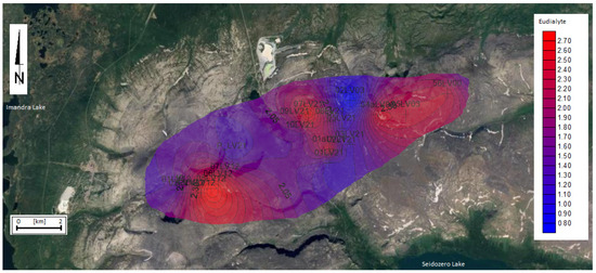 In the case of eudialyte (Figure 10), the lowest fractal dimension coefficients are found in the northeastern part of the massif.