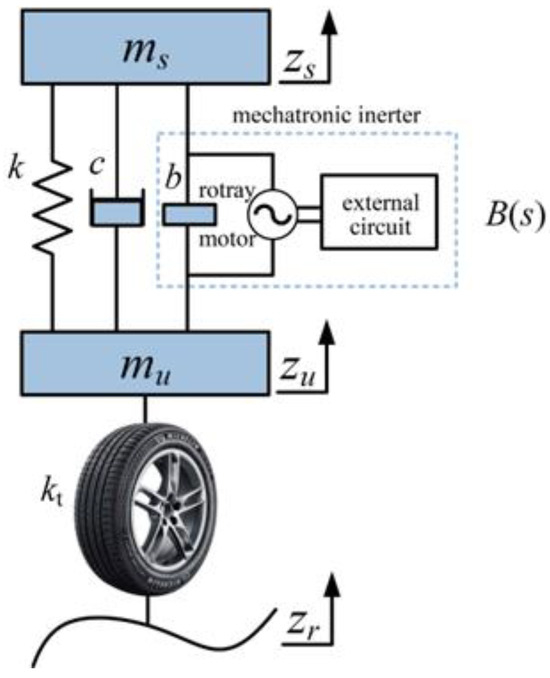 The vehicle suspension system is an essential component intended to support the weight of the vehicle body while mitigating the effects of uneven road surfaces. It plays a vital role in minimizing vehicle vibrations. Suspension performance has a major impact on vehicle driving safety, operating stability, and riding comfort. The evolution of suspension systems has progressed from traditional passive configurations, consisting of springs and dampers, to semi-active [1,2,3] and active suspensions [4,5,6]. Nonetheless, both semi-active and active suspension systems necessitate precise state and parameter estimation, often employing filter algorithms [7,8]. This complexity increases the challenges associated with their design and introduces drawbacks such as high energy consumption and elevated costs. By comparison, passive suspension still plays an irreplaceable role because of its simple and reliable structure. Traditional passive suspension systems face the challenge of structural solidification, limiting their ability to meet the increasingly demanding performance requirements of vehicle suspension, and the proposal of “inerter” [9] makes the suspension composed of “inerter-spring-damper” attract attention in the realm of engineering.
