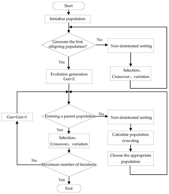NSGA (non-dominated sorting genetic algorithm) is a genetic algorithm based on the Pareto optimization concept. This algorithm improves the selection regeneration method on the basis of the genetic algorithm; each individual is stratified according to its dominant and non-dominant relationship, and then the selection operation is performed. However, the NSGA has some problems, such as high complexity of non-dominated sorting time and lack of elite retention strategy to improve the performance of the algorithm. NSGA-II, therefore, uses an elitism-based non-dominated sorting method for ranking and sorting each individual and uses a crowding distance approach in its section operator for keeping the diversity among the obtained Pareto optimal solutions [45]. The algorithm flow chart is shown in Figure 3.