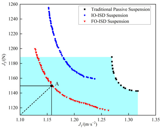 In the following, we will refer to the fractional-order ISD suspension as FO-ISD suspension and the integer-order ISD suspension as IO-ISD suspension in the text description section. Figure 4 shows the optimized Pareto front. It represents the curve formed by all the Pareto optimal solutions obtained in multi-objective optimization problems in the graph. This curve shows the trade-off relationship between different objectives. Choosing different optimal solutions on the curve means that the corresponding parameters can change the performance tendency of the suspension system. In Figure 4, the optimal parameter solutions for the FO-ISD suspension are represented by red triangles, the IO-ISD suspension is indicated by blue dots, and the black squares represent the optimal parameter solutions for the traditional passive suspension.
