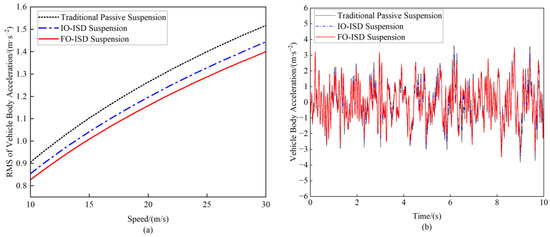 (a) Comparison of RMS values of vehicle body acceleration at speeds ranging from 10 m/s to 30 m/s. (b) Comparison of vehicle body acceleration at the speed of 20 m/s.