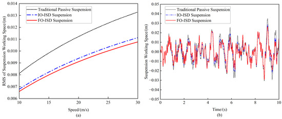 (a) Comparison of RMS values of suspension working space at speeds ranging from 10 m/s to 30 m/s. (b) Comparison of suspension working space at the speed of 20 m/s.