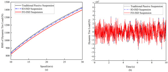 (a) Comparison of RMS values of dynamic tire load at speeds ranging from 10 m/s to 30 m/s. (b) Comparison of dynamic tire load at the speed of 20 m/s.
