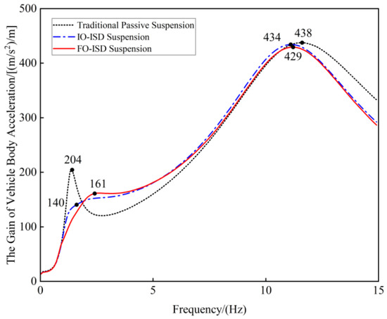 The vehicle body acceleration gain is shown in Figure 9. In the figure, the red line represents the FO-ISD suspension, the blue line represents the IO-ISD suspension, and the black line represents the traditional passive suspension. It can be seen from the figure that in the low-frequency band (0–5 Hz), although the low-frequency peak of the FO-ISD suspension exceeds that of the IO-ISD suspension, it is still better than the traditional passive suspension. In the high-frequency band (10–15 Hz), the differences in the high-frequency peaks of the three types of suspensions are very small. However, the performance of the FO-ISD suspension is always better than that of the traditional passive suspension and the IO-ISD suspension. This indicates that the fractional-order design enhances the energy dissipation capacity of the inerter through the complex impedance characteristics, thereby more effectively suppressing the body vibration.