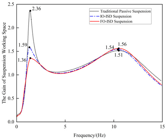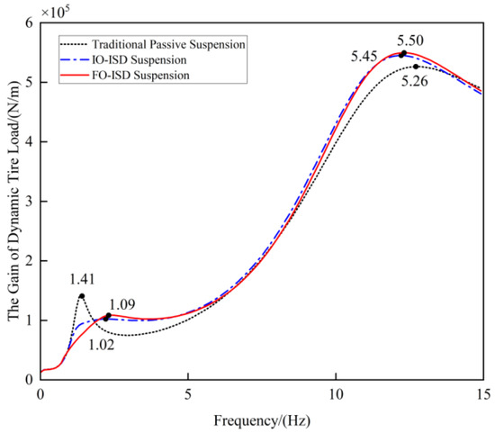 As can be seen from Figure 10, although both types of ISD suspensions are slightly worse at the high-frequency peak, the low-frequency gain of the suspension working space of the FO-ISD suspension is significantly better than that of the other two types of suspensions, effectively improving the working space of the vehicle suspension when working in the low-frequency band. In Figure 11, although the dynamic tire load at the low-frequency peak of the FO-ISD suspension exceeds that of the IO-ISD suspension, it is still better than the traditional passive suspension. At the high-frequency resonance peak, the FO-ISD and IO-ISD suspensions deteriorate slightly, respectively. Overall, the FO-ISD suspension is slightly worse at the high-frequency peak, but the overall trend is similar to that of the IO-ISD suspension. In the low-frequency range, due to the complex impedance, the FO-ISD suspension fully exerts the advantage of the inerter. Compared with the IO-ISD suspension, the low-frequency amplitude suppression effect is further enhanced in most frequencies.