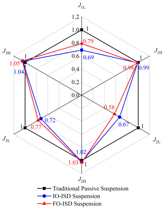 In Figure 12, the comparison of various indicators can be seen more intuitively. Among them, J1L denotes the low-frequency peak of vehicle body acceleration, while J1H represents its high-frequency counterpart. Similarly, J2L and J2H denote the low and high-frequency peaks of suspension working space, respectively. Meanwhile, J3L and J3H signify the low and high-frequency peaks of the dynamic tire load. In terms of body acceleration, although the J1L of the FO-ISD suspension in the low-frequency band is slightly higher than that of the IO-ISD suspension, it is still 21% lower than that of the traditional passive suspension. The low-frequency peak of the IO-ISD suspension is reduced by 31%. In the case of J1H in the high-frequency band, the performance of the FO-ISD and IO-ISD suspensions is similar. However, the FO-ISD suspension is still slightly better than the IO-ISD suspension and can further reduce body acceleration. In terms of suspension working space, the J2L of the FO-ISD suspension working space is reduced by 42% compared with that of the traditional passive suspension, and the IO-ISD suspension working space is reduced by 33%. This shows that the FO-ISD suspension can maintain the optimal suspension working space when working at low frequency. In the case of J3L in the low-frequency band, although the FO-ISD suspension is slightly higher than the IO-ISD suspension, it is still 23% lower than the traditional passive suspension. This effectively reduces the dynamic tire load of the vehicle and improves driving stability. In the case of J2H and J3H in the high-frequency band, the FO-ISD and IO-ISD suspensions exhibit slight deterioration. However, they are still within the acceptable range.