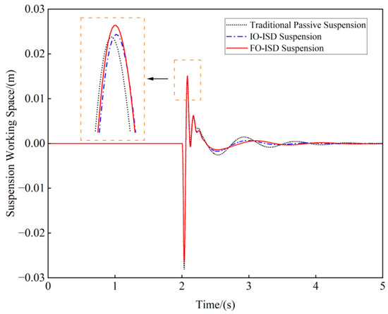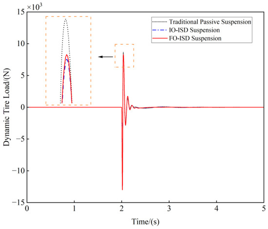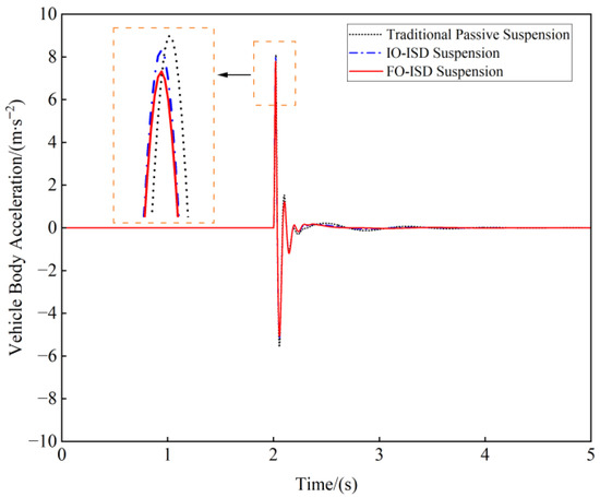 The vehicle is set to drive through a speed reducer with a height of 0.05 m and a width of 0.3 m at a speed of 10 m/s [52]. The impulse response of dynamic performance indexes is illustrated in Figure 13, Figure 14 and Figure 15; Table 5 shows the corresponding peak-to-peak (PTP) values.