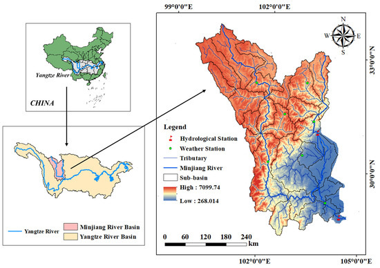 The MRB is located in the southwestern part of Sichuan Province, China (99°42′–104°40′ E, 28°20′–33°38′ N), and is one of the major tributaries of the upper Yangtze River (Figure 1). Covering a total area of approximately 137,000 square kilometers, the basin extends from the northwest to the southeast, spanning several administrative regions including Zoigê County, the Aba Tibetan and Qiang Autonomous Prefecture, Chengdu, and Meishan. The Minjiang River, with a total length of 735 km, originates from the Min Mountains at the eastern edge of the Tibetan Plateau and flows into the Yangtze River, serving as an important ecological barrier and water source area for the Yangtze River Basin. The climate within the basin is diverse, including plateau, mountainous, and basin climates. The upper reaches of the basin experience cold weather, with relatively low annual average temperatures and uneven precipitation distribution. In contrast, the middle and lower reaches feature a subtropical humid monsoon climate, with an average annual temperature of around 15 °C and annual precipitation exceeding 1000 mm, primarily concentrated in the summer. The ecosystem in the basin varies, with rich flora and fauna resources, making it highly valuable for biodiversity conservation.