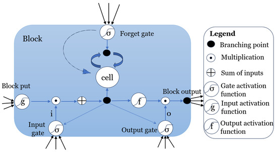 It, ft, ot are input, forget, and output gates, respectively; ct is a memory cell; ht is the output of the neuron’s short-term memory at time t; c′t is the memory from the new input; h is a hidden vector; σ is an activation function; W is a weight matrix; b is a bias term; [M,N] is the concatenation of two vectors; and ⊙ denotes the element multiplication.