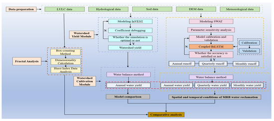 Finally, through a comprehensive analysis of the spatiotemporal conditions of water resource reutilization in the MRB, the output results of the InVEST model and the SWAT-BiLSTM model were collaboratively analyzed with the basin’s dimensional characteristics calculated by fractal dimensions to provide scientific evidence for sustainable water resource management strategies in the Yangtze River ecological barrier area. This in-depth exploration provides a framework and direction for future research on ecological environmental protection and water conservation. The process is illustrated in Figure 3.