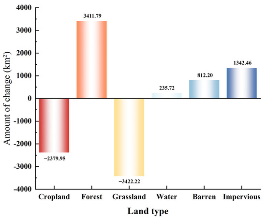 Between 1993 and 2023, the Min River Basin experienced significant land use changes. There is a general trend of decreasing agricultural land, especially between 2013 and 2023, reflecting accelerated urbanization and strengthened ecological protection measures. The increase in forest cover, particularly from 1993 to 2023, demonstrates the effectiveness of vegetation restoration efforts. The reduction in grassland area may be linked to human activities and climate change, while fluctuations in water and bare land areas indicate the effects of soil erosion and human development. Notably, the significant increase in impervious surfaces, especially since 1993, reflects the rapid pace of urban development.