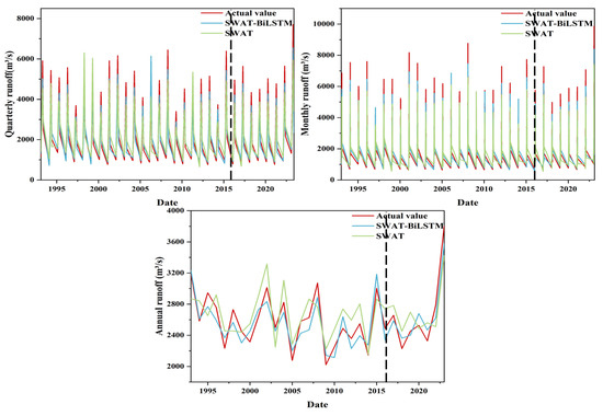 In this study, we conducted a comparative analysis of the runoff simulation capabilities of the SWAT-BiLSTM model and the SWAT model across different time scales. The results indicate that the SWAT-BiLSTM model demonstrates superior performance over the SWAT model in runoff simulations at quarterly, monthly, and annual scales. This superiority can be dissected from several aspects: