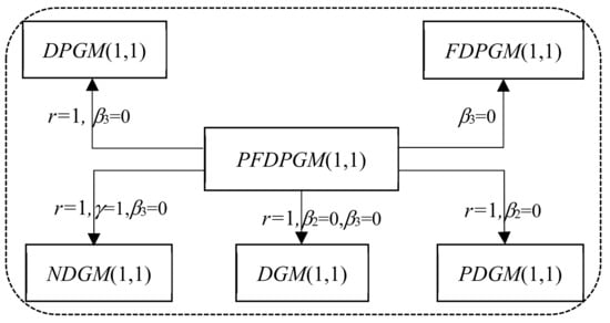 To facilitate the observation of the transformation relationships between the PFDPGM(1,1) model and the other grey prediction models in this paper, a transformation relationship diagram is drawn, as shown in Figure 1.