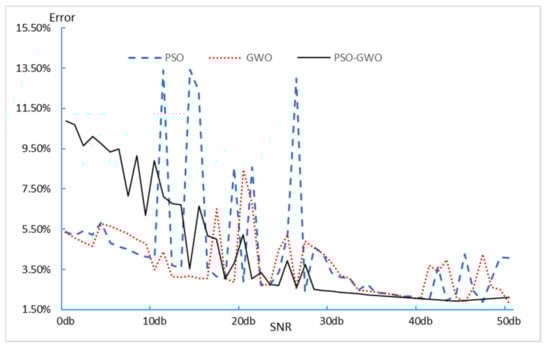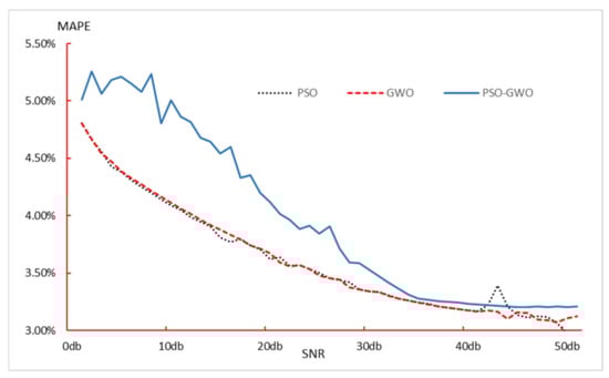 As shown in Figure 6, the average prediction errors of the models established using the parameters obtained by the three intelligent algorithms exhibit significant differences. Specifically, when the PSO optimization algorithm is used to obtain the model parameters for prediction modeling, the relative prediction error fluctuates considerably under high noise intensity. This leads to unsatisfactory prediction performance. However, when the noise interference level is low, the prediction error is relatively small, below 10%, but still shows some volatility. In contrast, the prediction error obtained using the parameters from the GWO algorithm exhibits a similar trend to that of the PSO algorithm but with more stable error values and no significant fluctuations. The prediction error curve obtained using the parameters from the PSO-GWO hybrid intelligent algorithm reveals that, regardless of the noise level, the prediction error remains below 10%. Moreover, when the noise disturbance in the data sequence is low, the model demonstrates better stability.