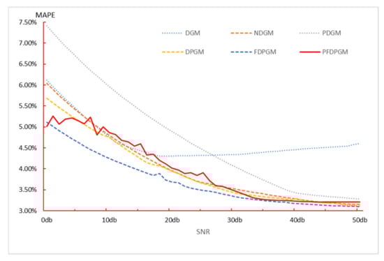 An interesting phenomenon can be observed when the data length is 10. As the level of noise pollution decreases, the prediction accuracy of the DGM(1,1) model declines, whereas that of the other models gradually increases. In fact, this phenomenon is attributed to the relatively simple structure of the DGM(1,1) model. When the preceding data show a significant upward trend yet the trend of the data to be predicted drops sharply, high noise pollution can mask the true variation trend of the data. Consequently, the prediction results may seemingly appear better. Conversely, as noise pollution decreases, the data sequence reveals its true variation trend, leading to a decline in the prediction accuracy of the model. This indicates that while discrete models can fit the overall trend of the data, they may fall short in capturing the detailed characteristics of data variations, potentially leading to reduced prediction performance when data fluctuations are pronounced.