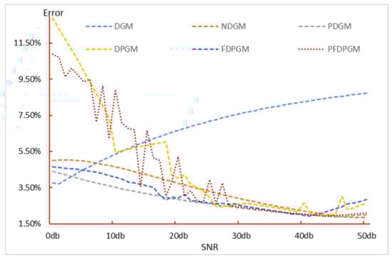 To illustrate the rationality of the proposed model, Figure 7 and Figure 8 present the simulation errors and prediction errors of several different gray forecasting models. From the perspective of simulation errors, all models exhibit a similar trend: the stronger the noise, the larger the simulation error. Additionally, the discrete gray models analyzed can effectively simulate the experimental data series, with simulation errors remaining below 10%. Among these, the PFDPGM(1,1) model demonstrates relatively balanced performance, with less fluctuation in simulation errors as noise levels change. Regarding prediction errors, the DPGM(1,1), NDGM(1,1), and PDGM(1,1) models show better predictive performance, indicating that gray models incorporating polynomial and power function features can better capture the characteristics of the data series. When the noise level is low, the prediction accuracy of the DPGM(1,1), NDGM(1,1), PDGM(1,1), and PFDPGM(1,1) models is relatively similar.