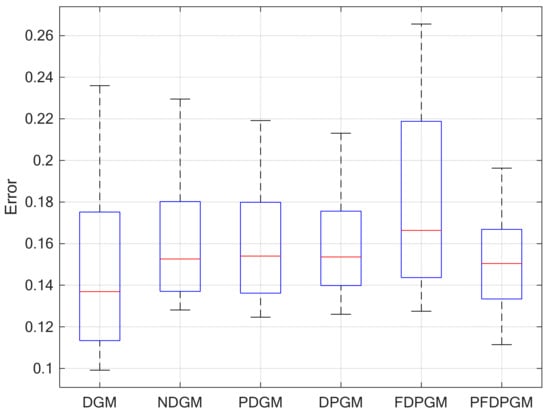 Figure 9 indicates that the PFDPGM(1,1) model outperforms the comparative models in fitting the abrupt data point. On the one hand, the range of fitting error variations at the abrupt point is relatively small across different noise levels, demonstrating the model’s robust stability in fitting data sequences with abrupt changes. On the other hand, the quartiles of the errors reveal that the mean simulation error of the PFDPGM(1,1) model is relatively low. This suggests that, on average, the structural characteristics of the model enable it to achieve better simulation performance for the data sequence.