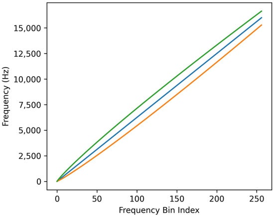 Following the production of the new frequency scale, a new spectrogram is generated by applying different weights that are based on the new frequency scale of a given audio spectrogram. This mapping approach uses similar designs of mapping spectrograms on different psychoacoustic scales [56]. In practice, by applying a set of equally distanced and overlapping triangular filters on the new frequency scale, a set of weights is calculated to be applied to the complex coefficients of the STFT.