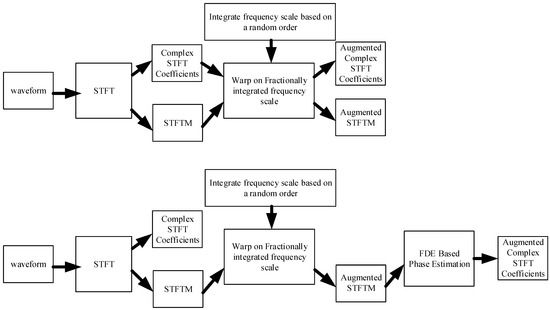 Using the proposed method, two augmentation strategies depicted in Figure 2 are applied. Augmentation Strategy 1 is quite straightforward. Firstly, for each complex STFT matrix of audio samples, a new frequency scale is calculated with respect to a randomly given fractional order. Then, the audio sample is mapped and warped on a fractionally differentiated frequency scale to produce a complex augmented STFT matrix. Augmentation Strategy 2 differs from the first strategy with the added method to its output. The complex STFT matrix is mapped and warped on the fractionally derived frequency scale to produce a complex augmented STFT matrix as in the first strategy. Additionally, the amplitude of the complex augmented STFT matrix is calculated and the new phase structure is produced by estimating with the Fractional Differential Equation (FDE)-based phase estimation method [61] to produce a new augmented STFT. Proposed by the authors of this work, this method is shown to be capable of producing consistent spectrograms. Further information is provided in depth in [61]. Additionally, in a related work by the authors [62], the mapping procedure of spectrogram coefficients on a new frequency-like scale is also explained.