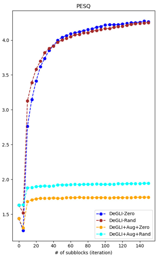 In Figure 5, the “DeGLI + Zero” curve shows the PESQ result when the complex component of the spectrogram is initialized as 0 and the non-augmented dataset is used for neural network model training. The “DeGLI + Rand” curve represents the results when the complex component of the spectrogram is initialized randomly and the non-augmented dataset is used for model training. “DeGLI + Aug + Zero” and “DeGLI + Aug + Rand” are results for 0 and random initializations on a network trained on the augmented dataset.