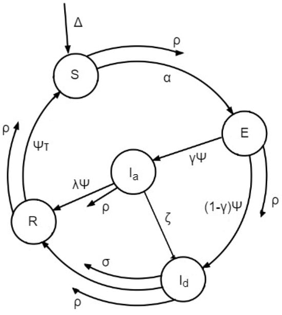 This model categorizes the population into five compartments: Susceptible individuals (S) are those who do not currently consume alcohol but are at risk of starting. Exposed individuals (E) are occasional alcohol users who are at risk of developing an addiction. Addictive individuals () are frequent alcohol users who are currently suffering from addiction. Depressed individuals () are individuals experiencing depression as a result of alcohol consumption. Recovered individuals (R) are those who have completed treatment and recovered from addiction. The total number of individuals (population), denoted by , is given as