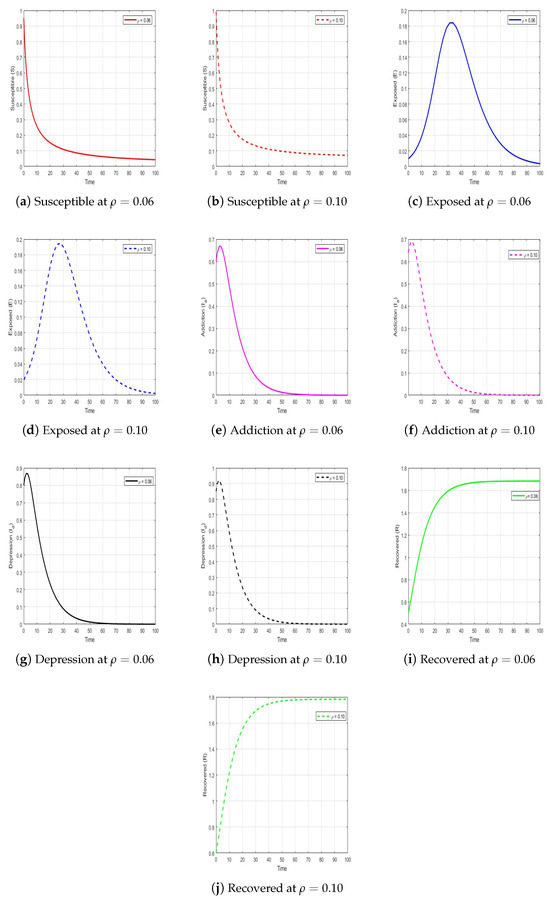 Using MATLAB 2021a for graphical representation, we simulate the numerical schemes using Equation . Using the initial data and with the parameters given in Table 1, we provide this summary of the findings of a numerical simulation of addiction dynamics. The simulation results indicate that, at the peak of addiction, the proportions of exposed and addicted individuals stabilize at 0.06 and 0.10, respectively. The rapid increase in addiction levels initially causes a rise in the number of depressed individuals, which eventually stabilizes at 0.10. Meanwhile, the percentage of recovered individuals fluctuates over time as the number of exposed, addicted, and depressed individuals decreases. It finally settles at 0.2, with changes in the parameter , as shown in Figure 2.