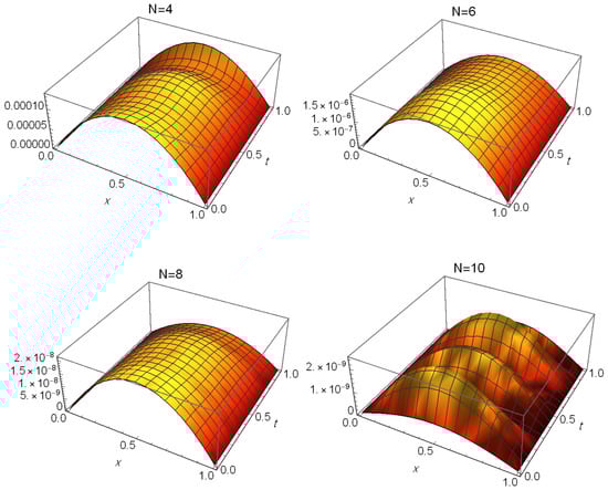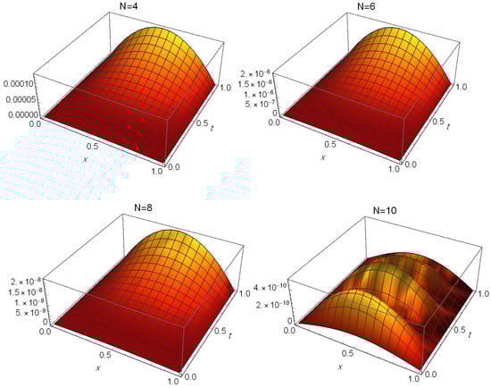 The AEs obtained via the suggested method at different values of N are shown in Figure 2, indicating that it is effective in providing a highly precise approximation of the exact solution. Table 3 gives a comparison of the MAEs between our method at and the methods in different literature. Table 4 also shows the MAEs and CPU time used. We see in these tables that the results are accurate for small choices of N. Also, this comparison reveals the superior performance of our technique over methods in [,,,,,].