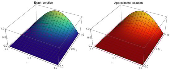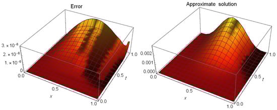 Table 6 displays the AEs at different values of t, , and Table 7 also displays the AEs at different values of t at and These tables indicate that the presented method is effective in providing a highly precise approximation of the exact solution. Figure 4 shows the exact solution (left) and the approximate solution (right) at and