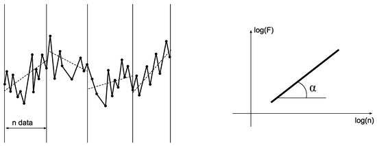 Representation of the DFA method. On the left, data are divided into windows with n data points each, with trend lines by subdomain (dashed). On the right, the log–log relationship between the average fluctuation and the data quantity n in the subdomains.