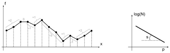 On the other hand, when the object is given by a function or sequential data, it is more appropriate for the characteristic elements to be defined by the size in the domain . Thus, an approximation associated with the domain size is made for the original function. The line in the relation between the total length and the characteristic length, given by the relationship , defines the dimension through the slope s using the key expression (17).