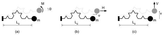 Simple oscillator corresponding to the second term of the Koch triadic. The elastic spring is bent due to (a) the action of a moment, (b) the action of a horizontal force, or (c) the action of a vertical force, as initial conditions [23].