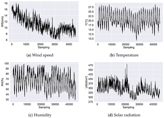 For the environmental data, the methodology involved a preliminary analysis of meteorological data acquired by SONDA, INPE [41], in Brazil. These datasets include wind speed, relative humidity, solar radiation, and temperature. The measurements were performed at various meteorological stations across the Brazilian territory from 2002 to 2019. The collected data (4062 files) were initially processed by discarding files with missing values (periods without measurements) and files with low data sampling or inconsistent values due to measurement errors, such as negative humidity values or those higher than 100%. After that step, 2100 files remained. Next, only meteorological stations that collected the four environmental parameters were kept in the analysis. Hence, only 548 files remained. Then, only those stations that had the four environmental parameters simultaneously identified were considered, reducing the dataset to only 48 entries. Finally, the datasets were selected in order to match the same location and date, yielding a set of just four files.