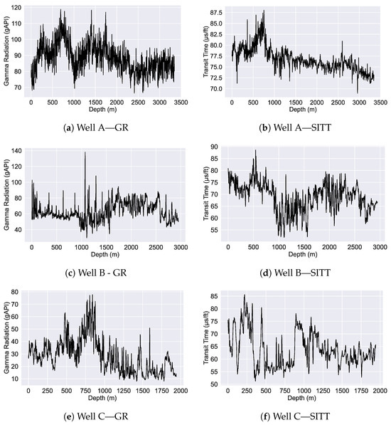 The next subset of natural data used to assess the proposed methodology refer to a geophysical dataset obtained from five different wells. In three of them (A, B, and C), gamma radiation (GR) and sonic interval transit times (SITTs) were measured (Figure 8). These variables were selected based on lithology criteria. Well A is from shale lithology (3.345 measured data points), well B is from sandstone (2.952 measured data points), and well C from limestone (1.942 measured data points), each one with a sample frequency of 0.15 m. The gamma radiation log unit is gAPI (gamma American Petroleum Institute Units), while sonic interval transit times’ unit is s/ft. They are both measured along the depth (m) of wells.